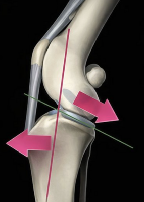 Le chien présente une pente tibiale entrainant lors de rupture de ligament croisé une poussée tibiale craniale et un glissement du fémur caudalement.